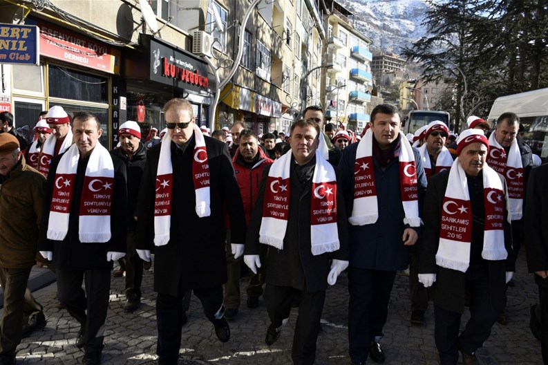 Yürüyüş boyunca açılan dev Türk bayrağının arkasından yürüyen gençler sık sık “Şehitler ölmez, vatan bölünmez” sloganları atarken ellerinde taşıdıkları Türk bayraklarını dalgalandırdı.