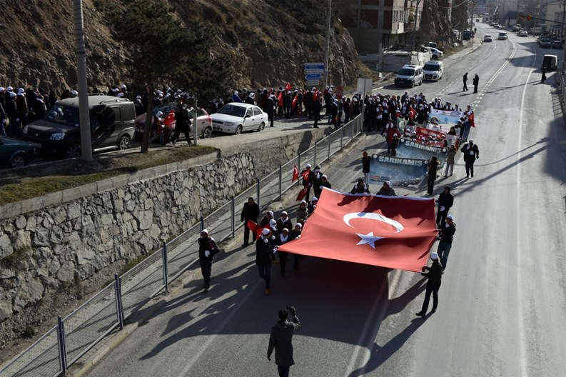 Yürüyüşün sonunda Zafer Meydanında düzenlenen anma programı ise İstiklal Marşı’nın okunmasıyla başladı. Tarih öğretmeni Fazıl Yazıcı’nın Sarıkamış harekatıyla ilgili katılımcıları bilgilendirmesinin ardından söz alan Gençlik Hizmetleri ve Spor İl Müdürü İsrafil Aslan, Sarıkamış Harekatının şanlı Türk tarihinin hüzünlü yapraklarından biri olarak hafızalarda yer almış bir destan olduğunu söyledi. Şartların tüm olumsuzluğu karşısında gösterdiği üstün cesaret, sabır ve metanetle, muharebe ettiği düşmanının bile takdirini kazanan Türk askerinin Sarıkamış Harekatında harp tarihinde eşine az rastlanır bir mücadele örneği sergilediğini kaydeden Aslan, büyük kayıplar verilse de vatan uğruna çıkılan bu yoldan asla geri dönmeyi düşünmeyen Türk askerinin direniş ve mücadele azminin üstünlüğünü bir kez daha ispatladığını ifade etti.